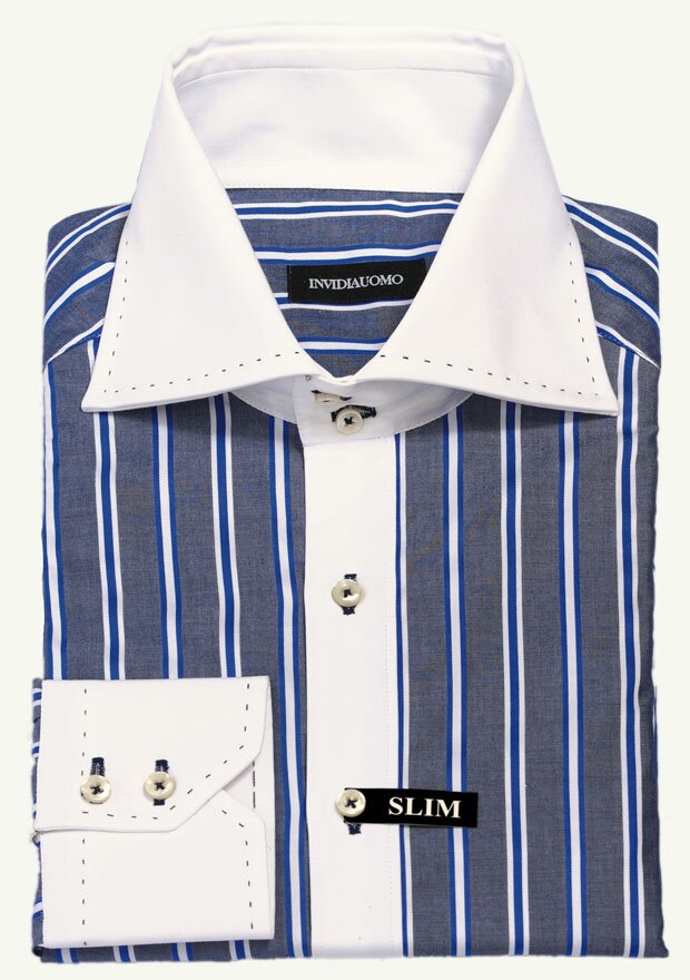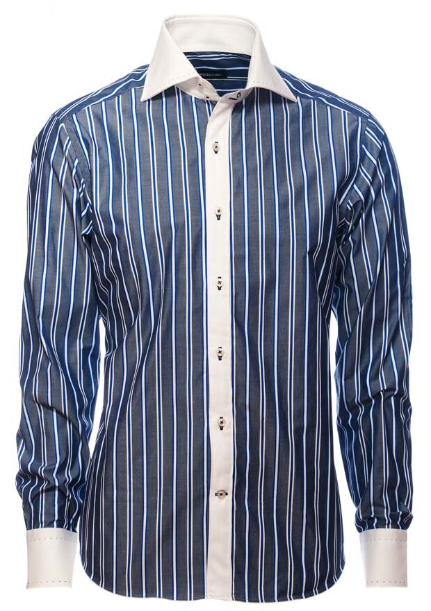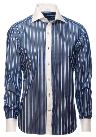 Праздничная рубашка в полоску с контрастными белым скошенным воротником и манжетами с имитацией ручного шва из хлопка Поплин подойдет тем, кто любит выделяться. Идеальный вариант как в комплекте с костюмом, так и самостоятельно.